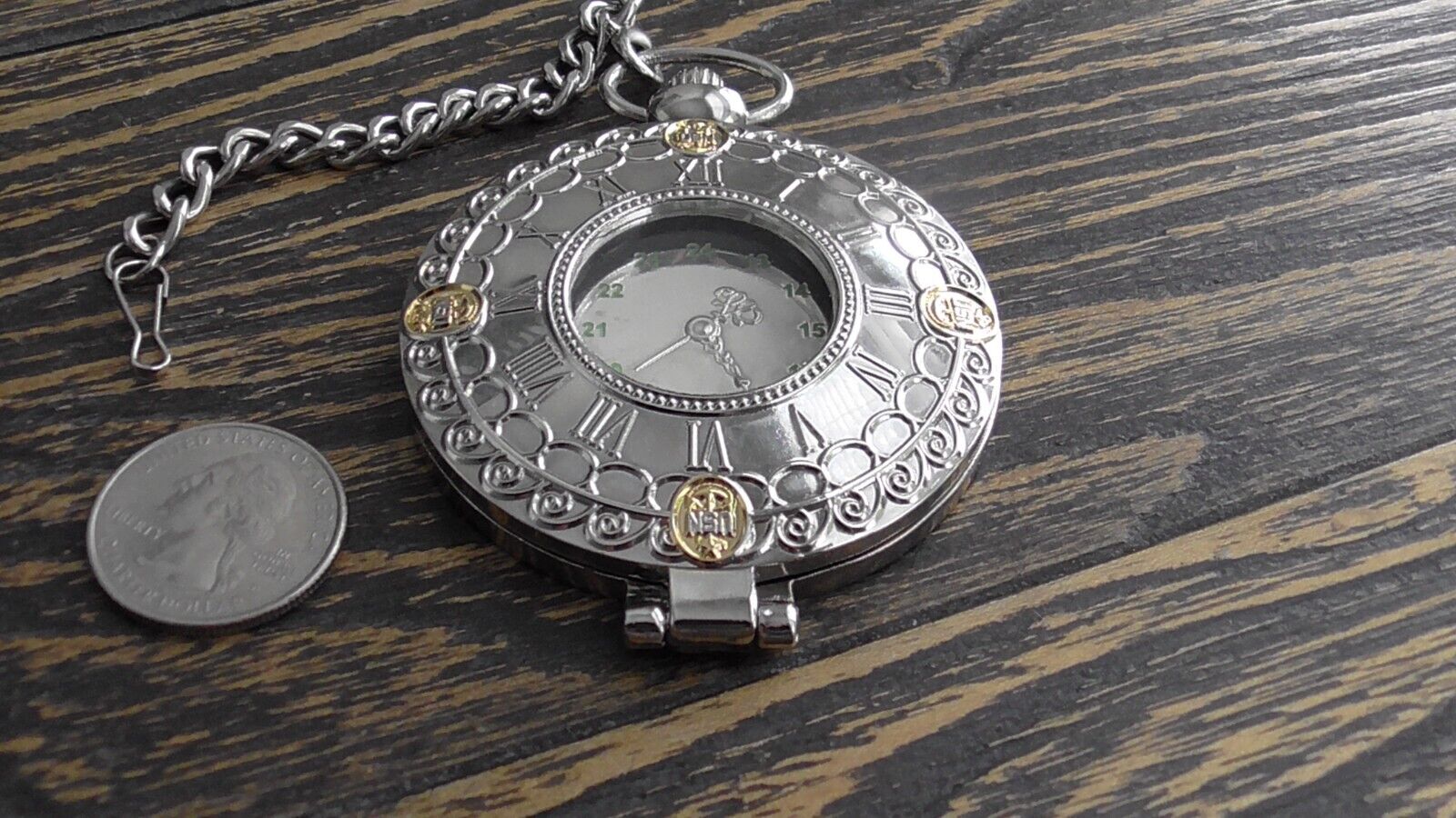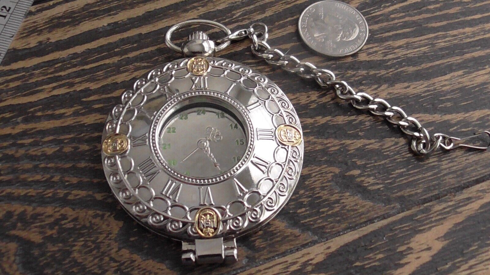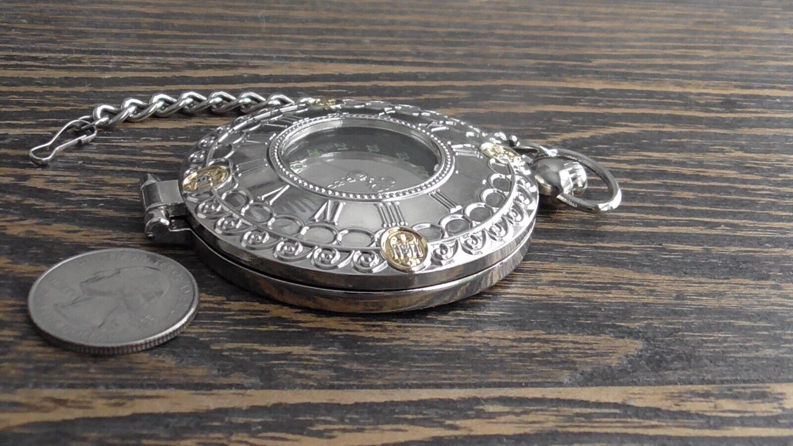 The pocket watch measures approx. 3 1/2 x 2 1/2" and the chain attached measures approx. 4" inches