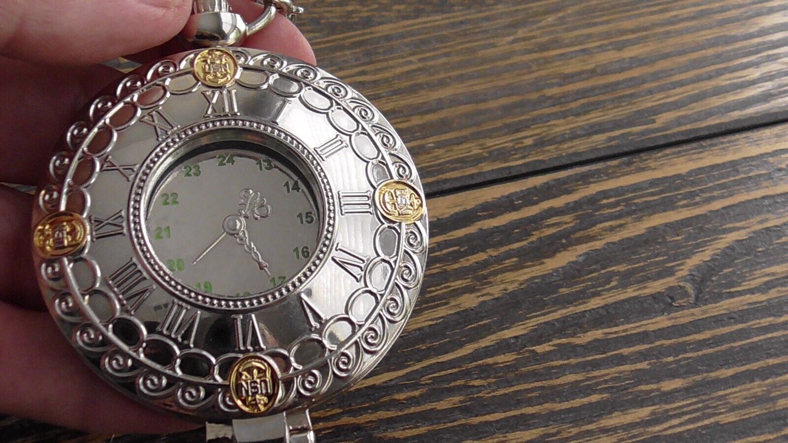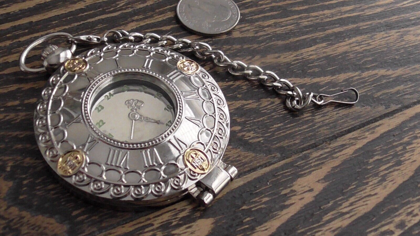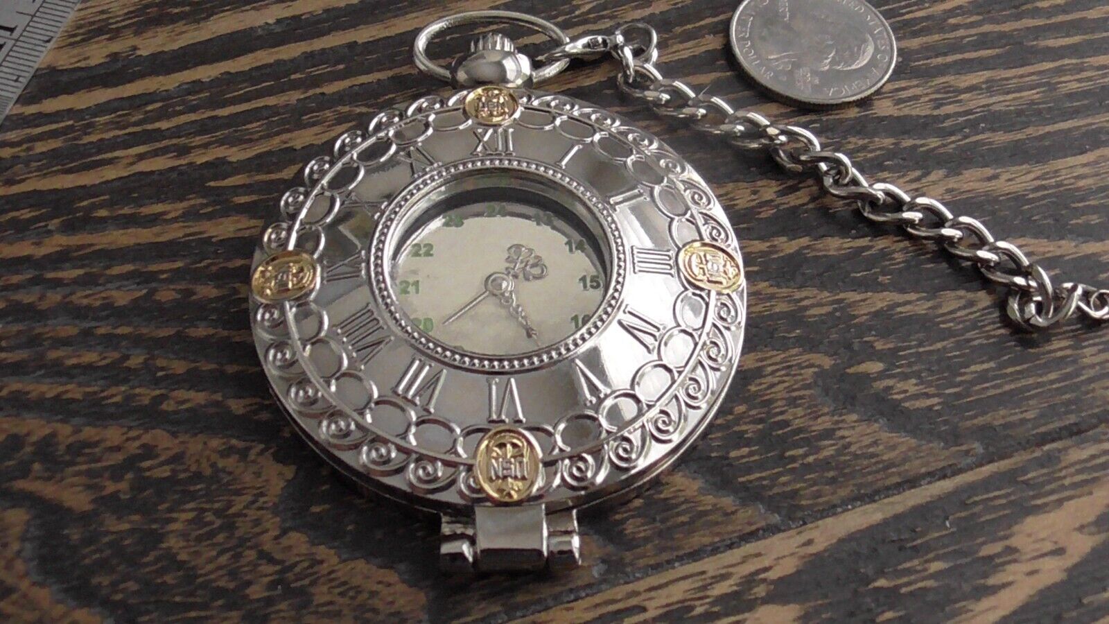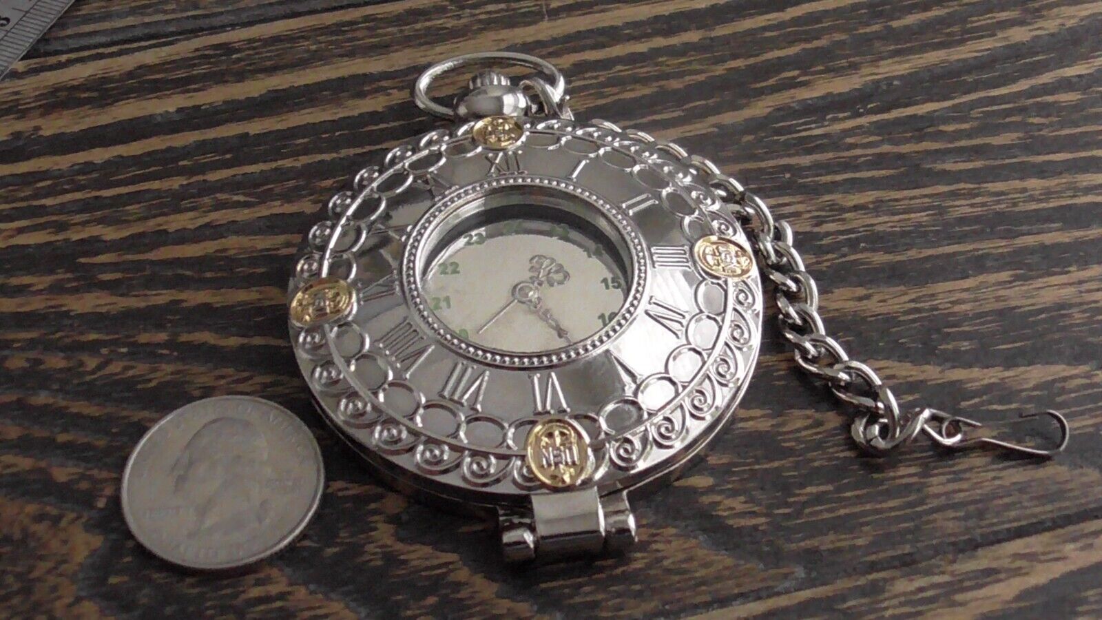 The pocket watch measures approx. 3 1/2 x 2 1/2" and the chain attached measures approx. 4" inches